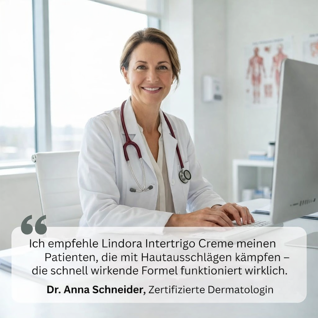 Als Fachärztin für Dermatologie mit langjähriger Erfahrung in der Behandlung von Intertrigo empfehle ich diese Creme, weil sie die Hauptursachen von Hautfaltenentzündungen gezielt bekämpft und gleichzeitig die Hautbarriere wirksam stabilisiert.